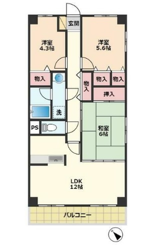 | 間取り | 3LDK | 間取り詳細 | 和6 洋5.6・4.3 LDK12 | 専有面積 | 65.54㎡ |